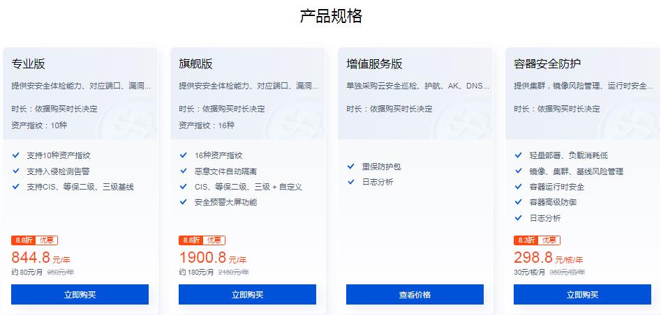 云原生企业:主打容器部署,容器安全防护模块 8.3 折后 298.8 元 / 核 / 年,轻量部署不占资源,镜像、集群的安全全管好,运行时还有高级防御;