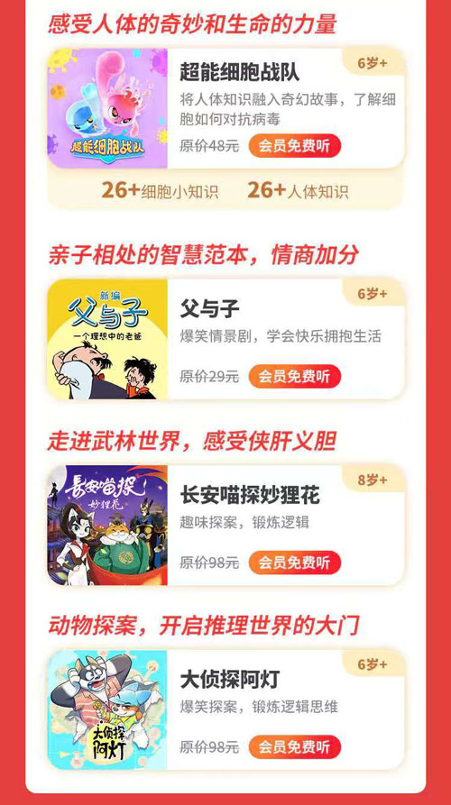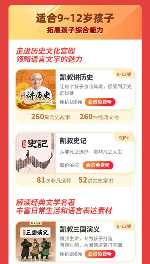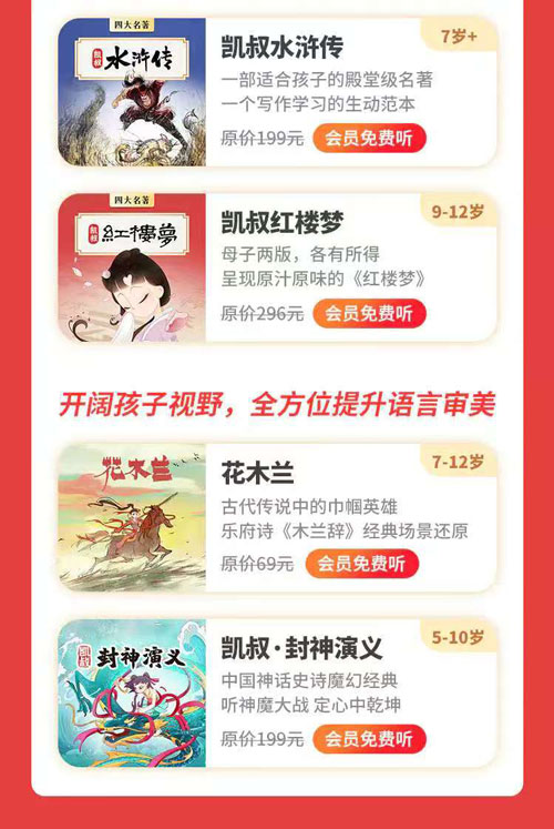 优先选长期套餐,单价更低凯叔讲故事会员优惠里,两年卡力度最大,直降 + 赠时长,日均成本不到 5 毛钱,畅听 3 万 + 集内容,包括名著、国学、科普、睡前故事。