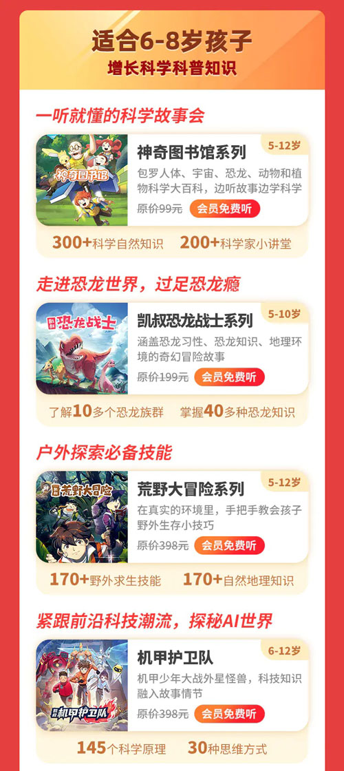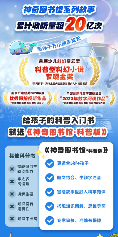 - 冒险剧情 + 科学讲解,像 “中国版神奇校车”,越听越入迷