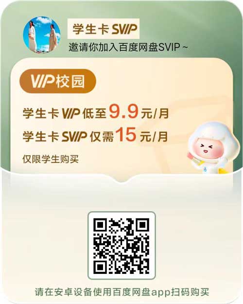 不管是大学生还是高中生,网盘都是学习刚需,但普通会员价格偏高,学生党很难长期承担——而百度网盘学生会员卡,专门为学生群体定制,认证后就能享受长期稳定优惠,比普通会员划算太多!