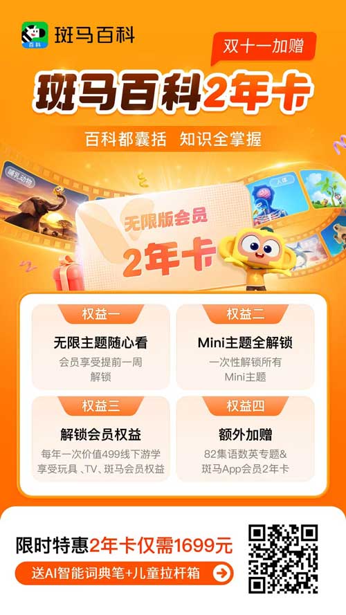家人们,斑马百科真的是宝藏,想让孩子在快乐中学习,轻松变身“知识小达人”,就赶紧安排起来!现在扫描下方二维码,即可让孩子开启奇妙知识之旅!