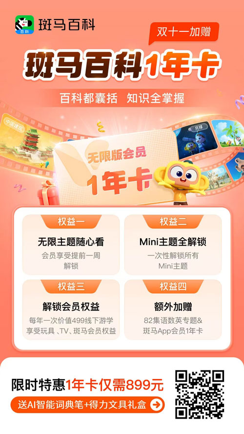 1年卡:原价999元/年,活动价899元 ,可自选12个主题课程,还能解锁所有mini主题,享有中英双语权益。