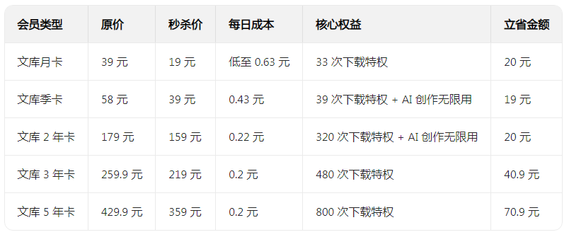 导读:本文整理百度文库会员限时秒杀活动,涵盖单一会员(月/季/2/3/5年卡)及多档联合会员套餐,详解各档位价格、每日成本、下载特权与立省金额,附官方购买链接,帮你挑选高性价比方案,低成本解锁海量文档与AI...