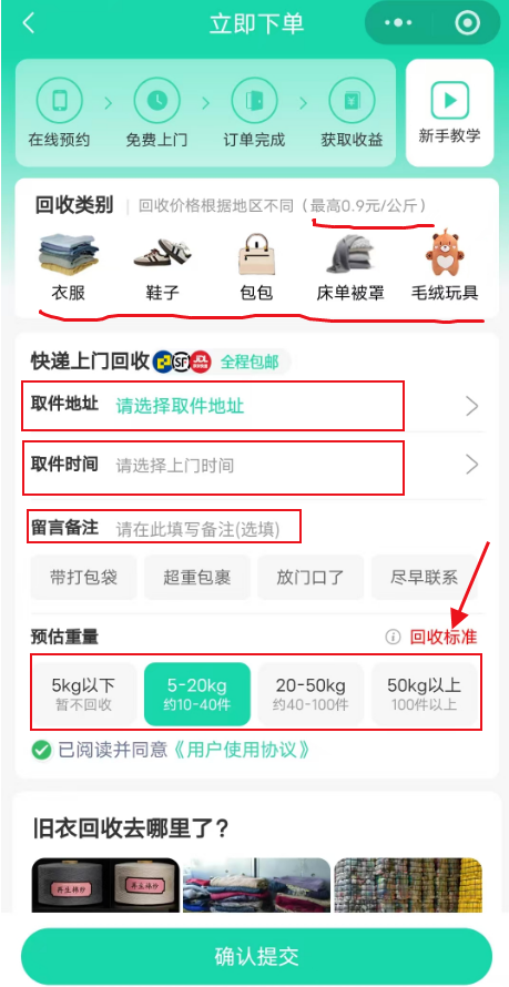 - 在线预约:用户进入旧衣物回收小程序,选择“旧衣回收”功能,填写上门回收地址、联系方式及预约时间。