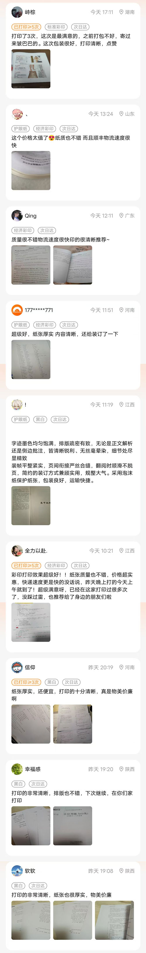 界面清爽:微信小程序一键上传,老人小孩也会用定价透明:黑白低至5分起,彩印平价,无隐形消费配送灵活:支持普通快递与加急,满足临时打印需求场景贴合:适合作业彩印、小批量资料、手抄报、作业纸、文档打印售后稳妥:订单可查、漏印/质量问题可售后处理时效稳定:20:00前下单当天发出,多数地区次日达