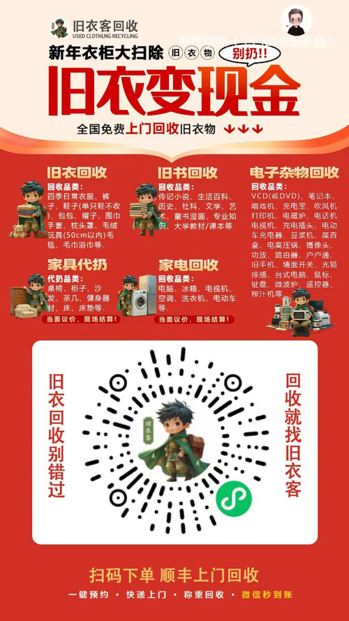 大扫除结束,家里堆成山的旧物不知道怎么处理?别扔垃圾桶,交给「旧衣客」,免费上门帮你清走,还能换现金!