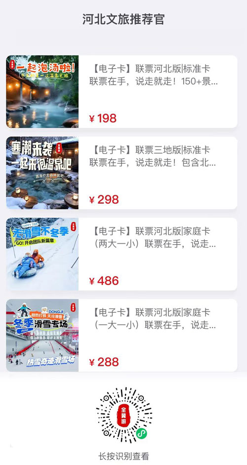 购卡:扫描或长按识别下方专属优惠海报,选择 “河北文旅一卡通家庭卡(两大一小)”,支付 486 元即可获得电子卡。