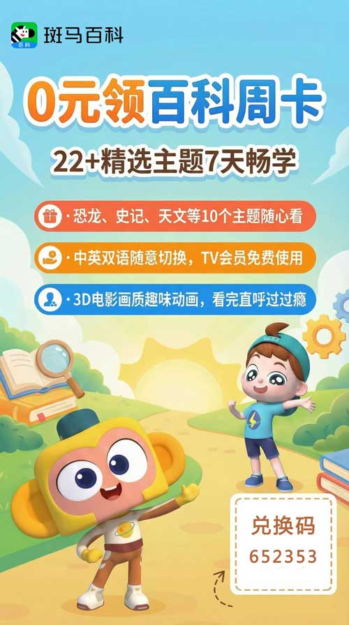家有 3-12 岁娃的家长看过来!不想花钱又想给孩子优质科普资源?斑马百科专属福利来袭 ——7 天免费体验周卡 0 元送,兑换码 652353 直接解锁海量硬核内容,让孩子在趣味中探索世界,赶紧码住这份薅羊毛攻略!